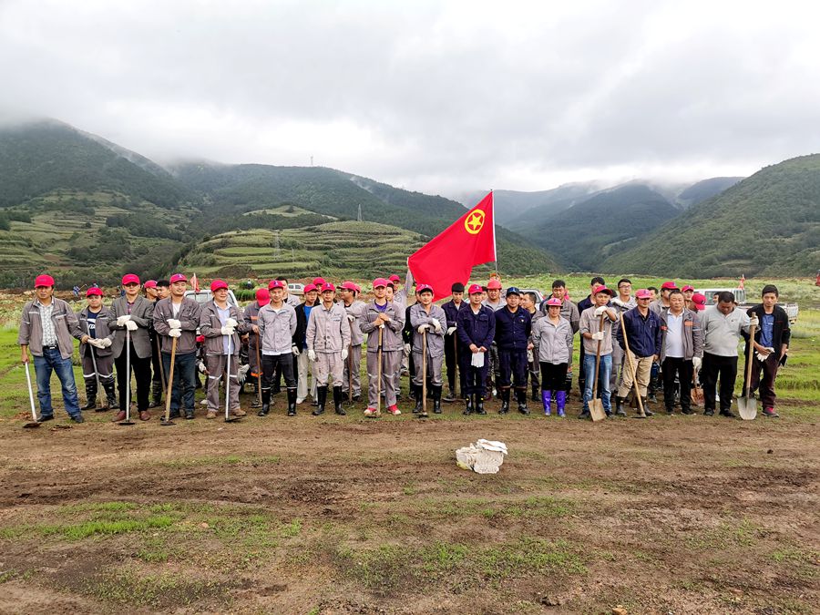 当下正处雨季,先锋矿区降雨一直到中午才停歇。下午14:00,团员青年们铆足了干劲,按照公司安全环保部的统一部署和要求,一声令下,大家井然有序的进入指定位置开始劳作。植树现场,鲜艳的团旗高高飘扬,虽然因降雨泥泞和湿滑,但是大家不怕泥水弄脏衣服,团结协作,有人运送树苗,有人撒施化肥,有人挥锹挖坑,有人仔细栽苗,有人铲土培土,有人浇水灌根,有人支护正苗,大家热情洋溢、劲头十足,处处都是忙碌的身影。还有来自各党总支的部分党员同志率先垂范,既指导团员青年如何种树,又叮嘱大家保护好自己。一番热火朝天的劳作后,一棵棵新树迎风而立,一排排绿意盎然覆盖了排土台阶。